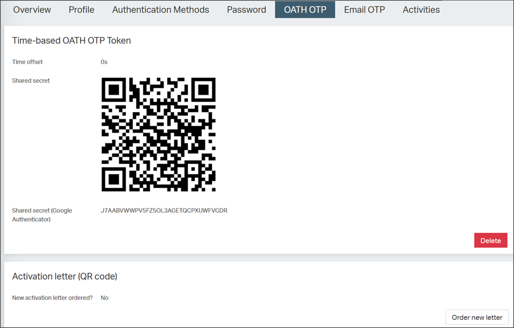 If you order an activation letter for the same end-user multiple times, IAM will reuse the existing shared secret associated with this end-user's OATH OTP account for each ordered letter. If you want to create a new shared secret (e.g., because the end-user lost the activation letter before enrolling a new device), you must perform the next steps: