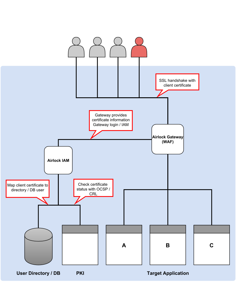 - Airlock IAM: receives client certificate information from Airlock Gateway