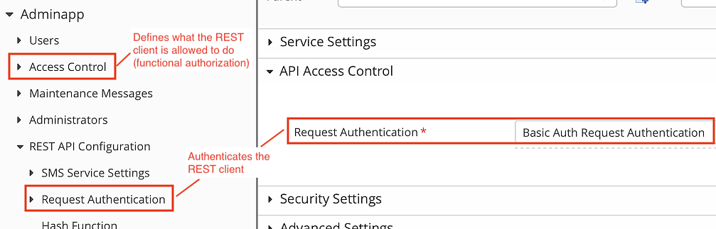 Property Adminapp >> Access Control defines the authorization of an authenticated REST client in the Adminapp REST API.
