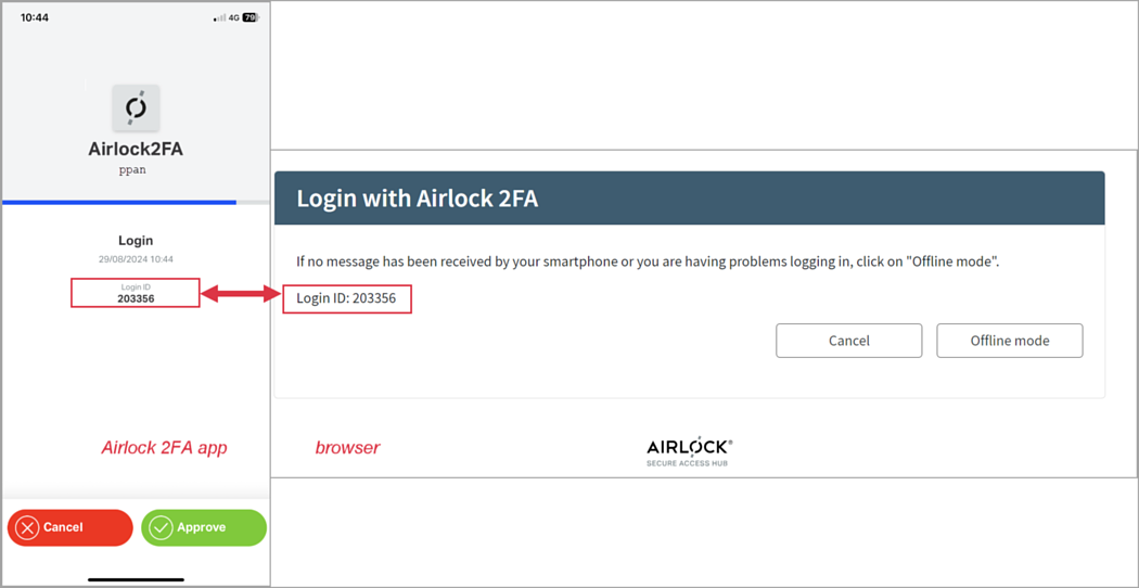 (4) | The Airlock 2FA app asks the user to approve (or deny) the authentication step. The smartphone must be unlocked. Depending on the smartphone's capabilities and setup, this may involve a PIN, fingerprint, or face recognition.