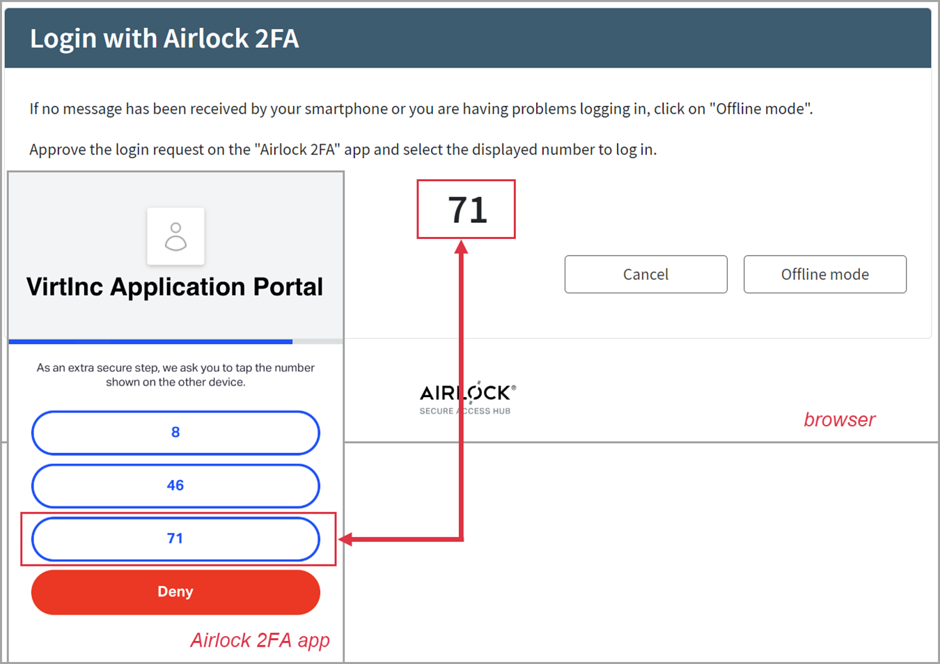 (8) | The Airlock 2FA app challenges the user to select the correct number. The correct number is the value shown on the login page in the browser. |