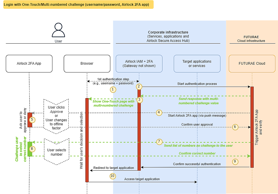 (9) | The Airlock 2FA app sends the user's selection to the Futurae cloud. If the user selects the correct number, the Futurae cloud will inform Airlock IAM about the successful authentication. |