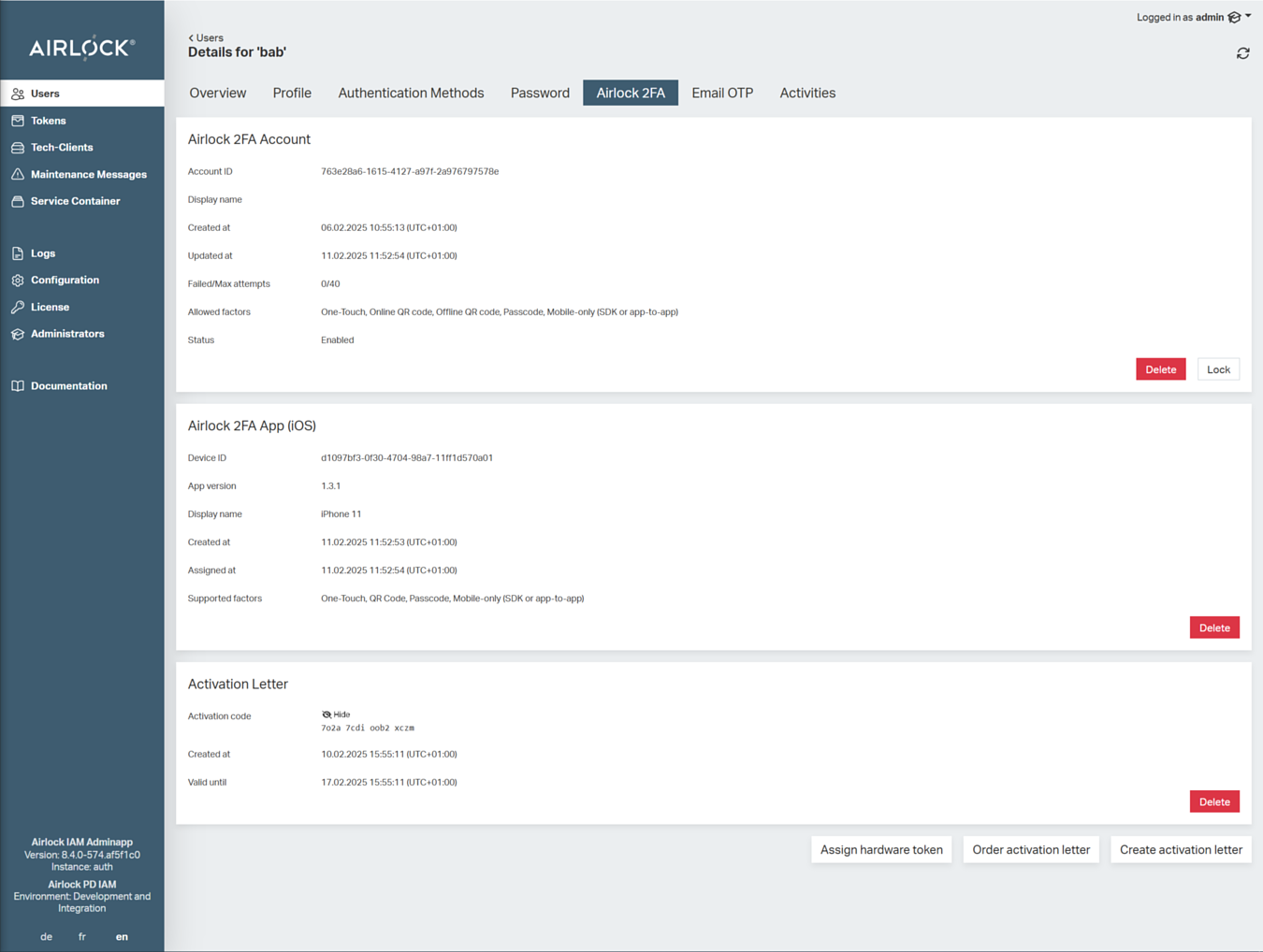 The following screenshot shows the Airlock 2FA tab for a specific end-user in the Adminapp. The tab contains information on the end-user's Airlock 2FA account and -device, and an activation letter (if available).