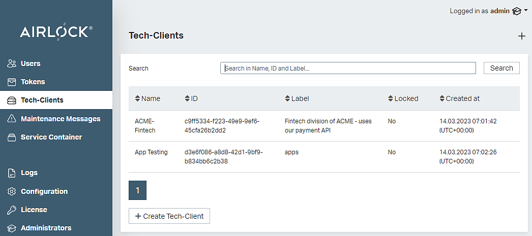 Tech-Clients are managed in the Airlock IAM Adminapp or over the Adminapp REST API.