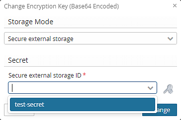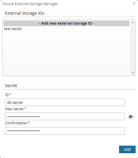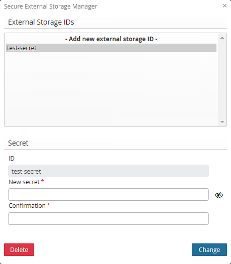 - Click on the button in the toolbar. The dialog supports adding, removing, changing, and deleting external secrets. External storage IDs available in the manager can then be referenced in the Change Password dialog to use them for a specific property.