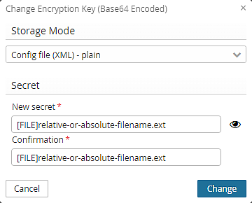 - Click on the button when editing a sensitive property. Subsequently, choose between Secure external storage (use this as the default choice), Config file (XML) - obfuscated (not encrypted), or Config file (XML) - plain from the Storage Mode drop-down. The storage IDs previously configured in the Storage Manager can be selected.