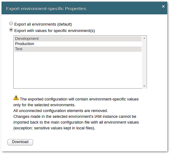 In the above example all plugins and properties that are relevant for the Production environment are NOT included in the exported configuration.