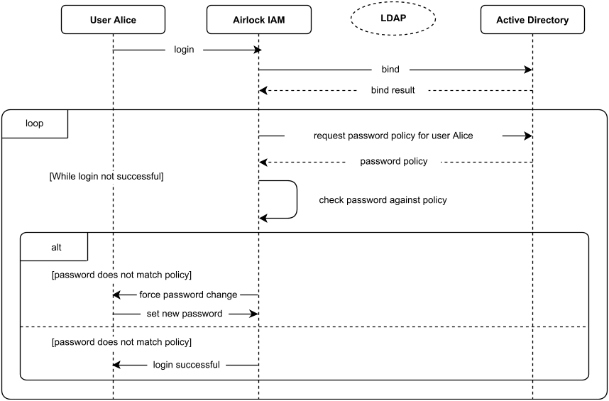 If configured, on each login of a user, his/her current password is checked against the password policy set in the AD. To retrieve the current policy, Airlock IAM binds itself with a service user to the AD and requests the policy with the user's DN. The service user can be configured in Airlock IAM. If the password does not meet the requirements anymore, e.g. it's expired, the user is redirected to a password change page and forced to set a new password. Password changes correspond to the use described below. The new password is only accepted if it meets all requirements of the password policy. After a password has been successfully set, the user is authorized and logged in to the application.