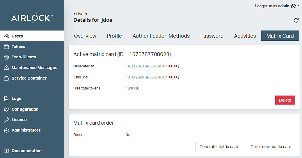 Matrix cards can be managed in the user management part of the Adminapp. It roughly offers the following features:
