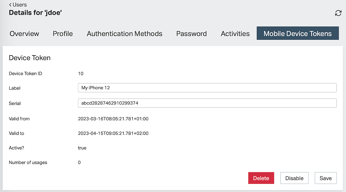 This results in an Adminapp UI as in the following example (showing only one device token - supporting multiple):