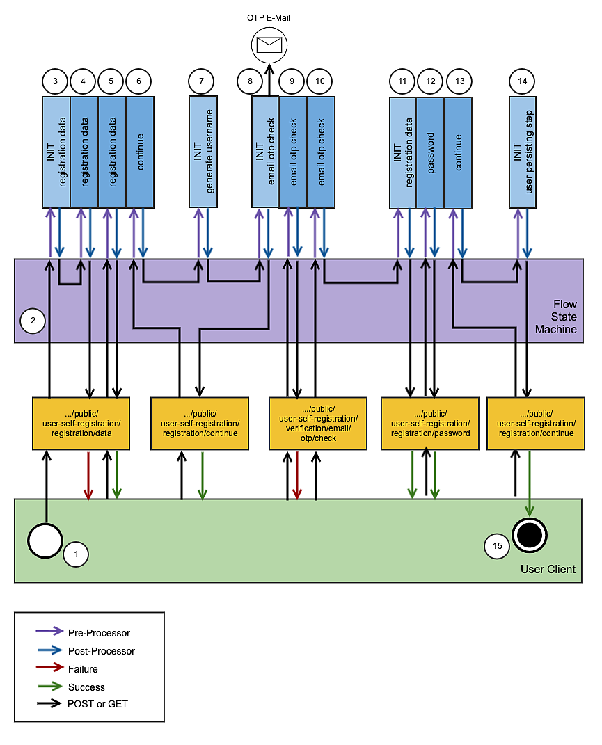 This diagram reuses the example flow sequence presented in User self-registration REST API: