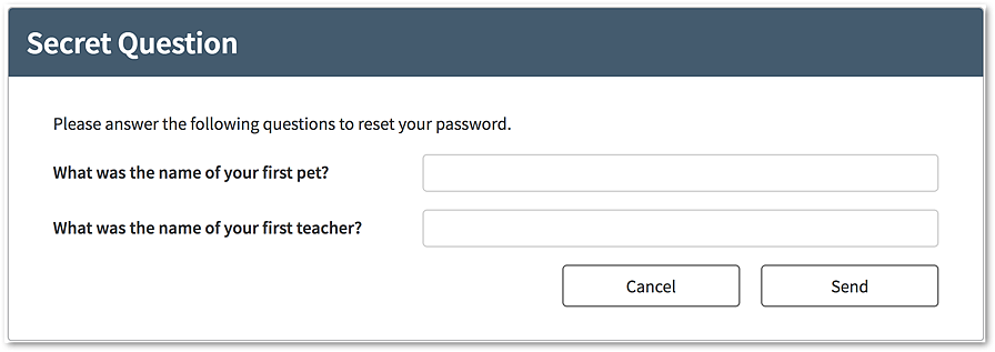 Toggle navigationAirlock Secure Access HubAbout this documentAbout Airlock IAMIAM 8.5 release notesSecurity best practicesInstallation and upgradeOperationInitial configurationConfiguration managementAuthenticationInteraction modelsAuthentication methodsUsername and passwordPassword repositoriesPassword policiesPassword change self-servicePassword reset self-serviceReset flow exampleReset using email and mTANReset using email linksReset using secret questionsExample screen flowUsage of secret questionsExample screen flowsGeneral informationPassword lettersPassword end-to-end encryptionHSM supportAWS KMS supportAirlock 2FAFIDO / PasskeysmTAN/SMSOATH OTPCronto (OneSpan)Digipass OTPEmail OTPMatrix cardToken auth via RADIUSClient cert. authn (X.509)Front-side Kerberos authn.SSO ticketsRemember-MeStep-Up authenticationRisk-based authenticationFailed logins and temp lockingUsername transformationMaintenance messagesUser representationEvents and notificationsLogin from new deviceActions on log outSelf-servicesTarget applicationsOAuth and OIDCSAMLAPI access controlFlows (Airlock IAM concept)Loginapp ConfigurationAdminapp ConfigurationService Container ConfigurationTransaction Approval ConfigurationIAM REST APIsCustomizing UIs and textsThird-party licensesAuthenticationAuthentication methodsUsername and passwordPassword reset self-serviceReset using secret questionsExample screen flowPassword reset example: Using secret questionsStart self-service on the login page:Enter username:Ask the user to answer secret questions:Choose a new password:Confirmation: