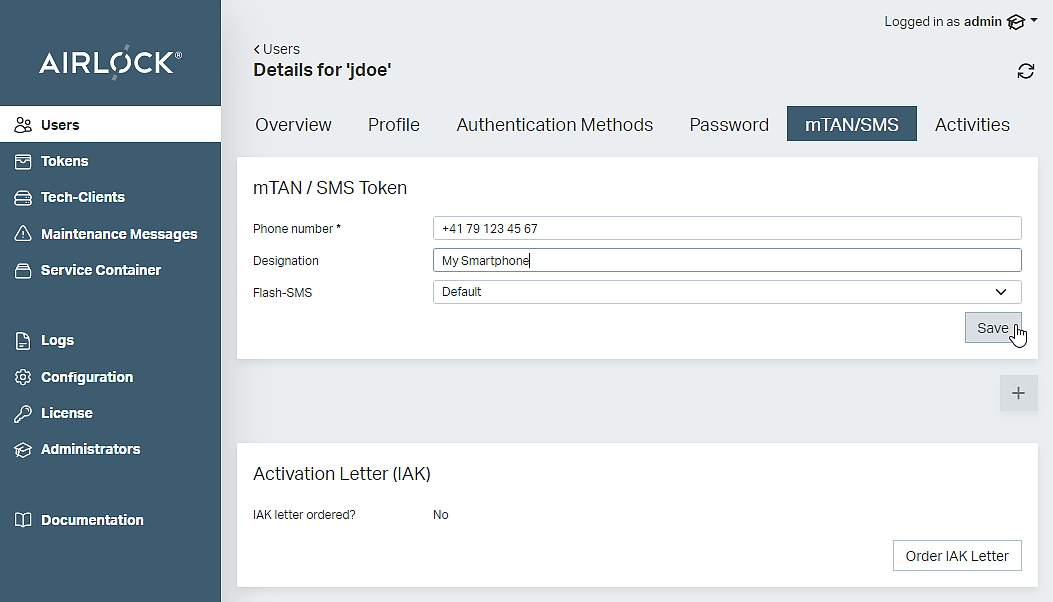 - Order the letter in the Adminapp (or other process): this sets a flag on the mTAN token. The Token Report Task (using the mTAN IAK Token Report Strategy) in Service Container then creates IAK letters.