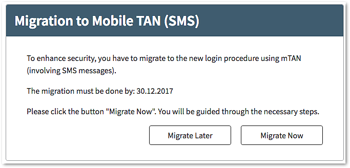 - The user is asked to migrate to mTAN/SMS.