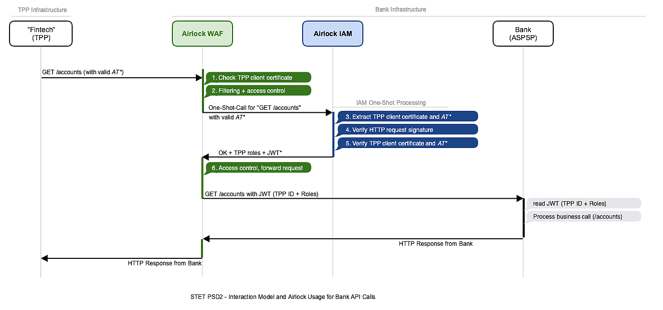 6 | Access Control, forward request | Airlock Gateway | Access control again (check, whether the roles provided by IAM are sufficient to let the request pass) and forward request to the bank's API service. The JWT with the TPP ID and roles issued by IAM is attached to the request (as HTTP header). The bank's REST service may use it to process the business call. |