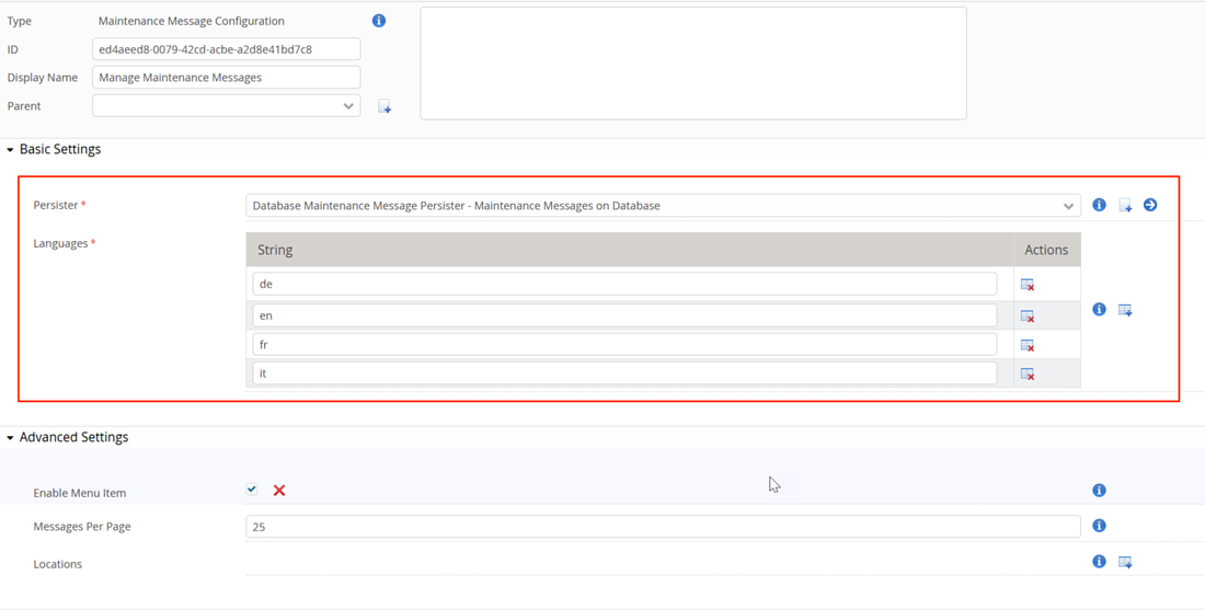 The first step for configuring maintenance messages defines the Maintenance Message Configuration with a persister and the languages the user interface supports in the Config Editor.
