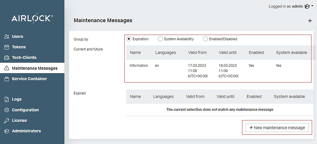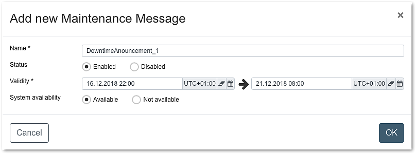 - Status: each maintenance message can be enabled or disabled. This is independent of the validity time period. A message that is in the validity time period will still not be displayed if it is disabled.