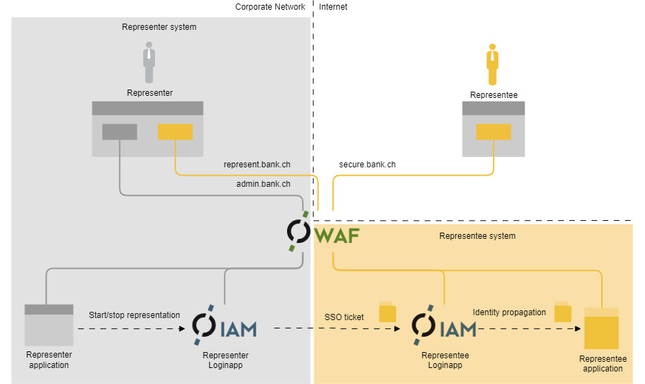 - The mapping on virtual host represent.bank.ch allows the use of the SSO parameter for representation. However, it should only be accessible from the internal network.
