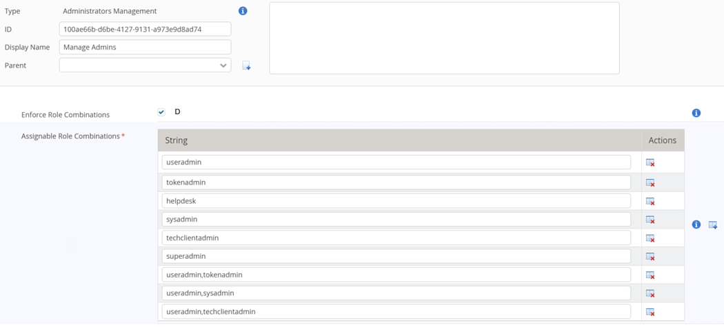 It is possible to assign a set of roles to each administrator. In the configuration of the Adminapp you can define the sets of possible roles combinations.