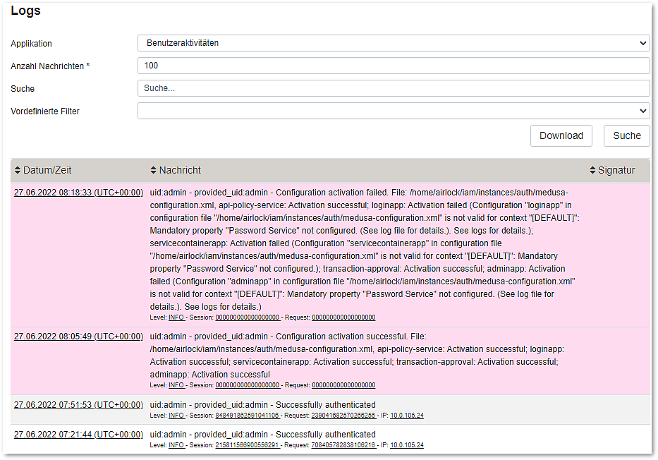 More details can be looked up in the Airlock IAM Adminapp. Change to the Adminapp browser tab and select Logs in the left navigation column. This will display the latest log information, where any error logs will appear with a red background color.