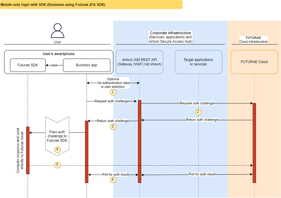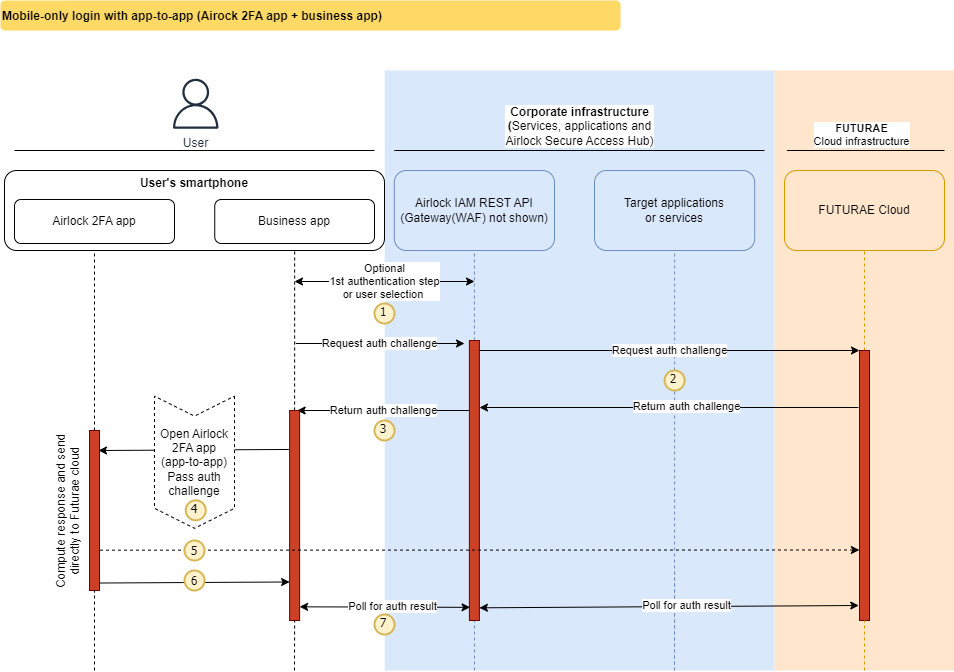 Business app with SDK | The target application is a smartphone app (e.g. mobile banking app) and has the Airlock 2FA authentication function built into it by using Futurae's SDK. This case is described further below. |