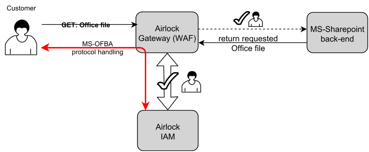 When using a setup of an Airlock Gateway and Airlock IAM, these components take over the complete handling of the MS-OFBA protocol. The target MS-SharePoint back-end is only accessible through the Gateway after successfully being authenticated by IAM.
