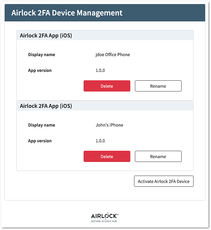 The Airlock IAM Loginapp provides self-service features that allow logged-in users to manage their own Airlock 2FA app devices.
