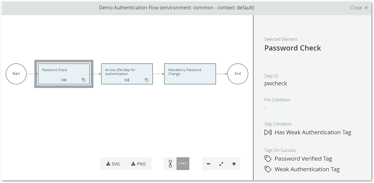 Airlock IAM flows can be visualized by clicking the visualizer button next to the flow property – this opens the integrated Flow Visualizer. It creates a flow chart based on the current flow configuration.
