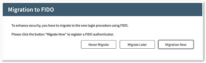 - Dialog in which the end-user is asked to migrate to FIDO (during login process):