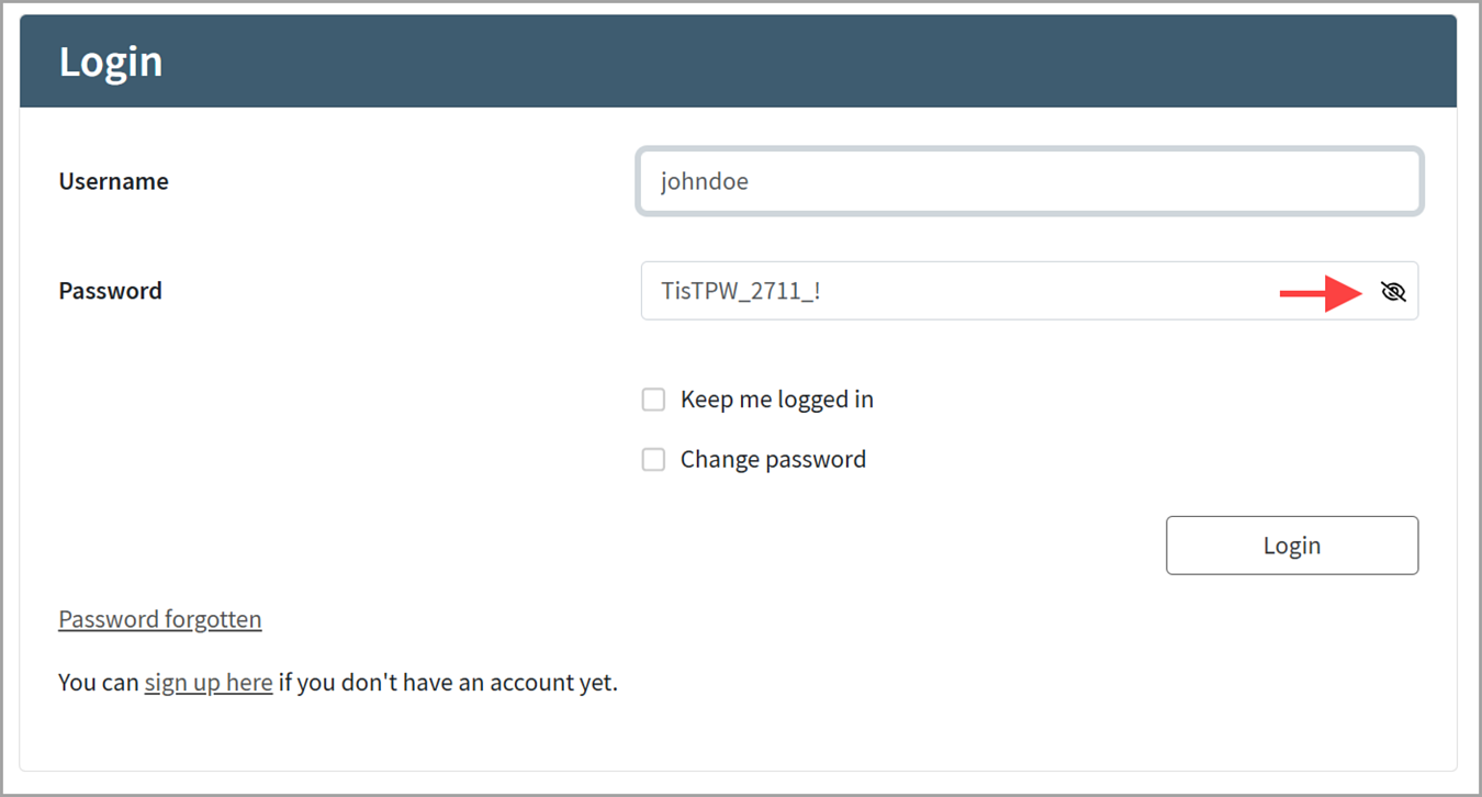 You can use the Loginapp Design Kit to enable the “Show Password” toggle. This toggle allows end-users to see their entered password in plaintext. The toggle itself is an eye icon visible on the right-hand side of the Password input field.