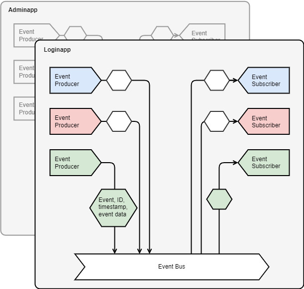 By design, the event bus is limited to the boundaries of the module (Adminapp or Loginapp) as shown in the illustration below: