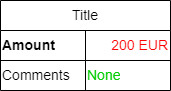 Title{CENTER}&{BOLD}Amount=200 EUR{RED}{RIGHT}&Comments={GREEN}None...the output will look like this: