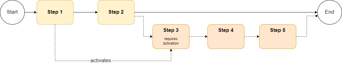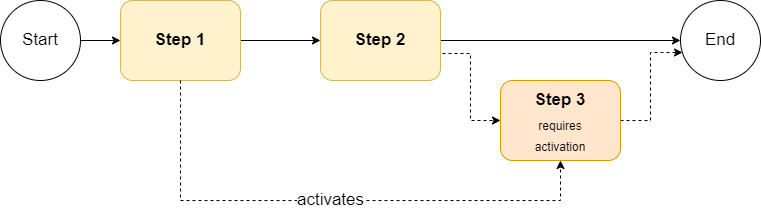 Consider the following example flow. Step 1 and Step 2 are processed in order but Step 3 is only processed if it has been activated by Step 1. If it has not been activated, it is skipped.