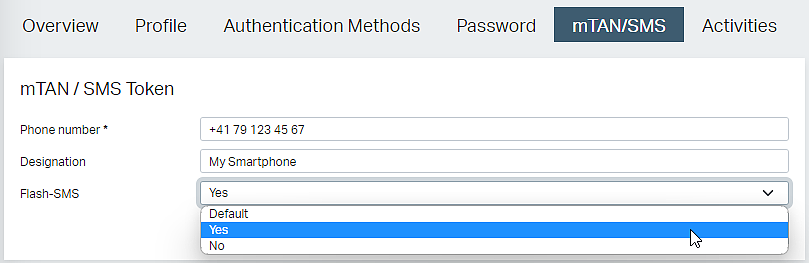 If using the Adminapp plugin mTAN/SMS Token Controller to manage mTAN tokens in the user management, the administrator may choose for each user, whether flash SMS or not should be sent: