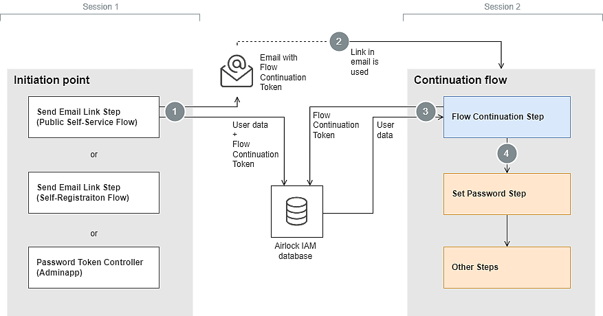 Note that the initiation point and the public self-service continuation flow with the Flow Continuation Step do not have to operate on the same HTTP session. This is because the user information associated with the Flow Continuation Token is stored in the IAM database.