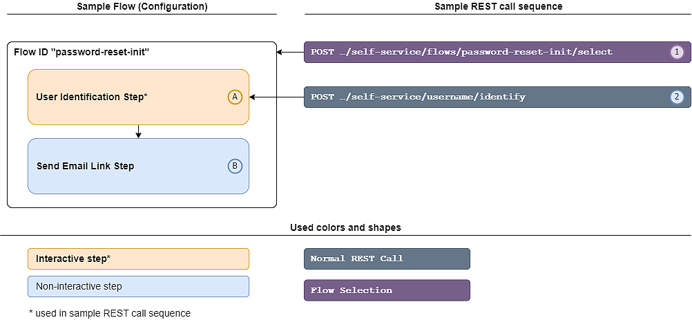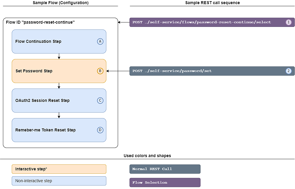 | A | Provide the name of the user for which the password reset flow should be executed. | This step is required to start the flow and to select the user. By default, this step will complete with 200 OK, even if the user cannot be found, the account is locked or invalid. This is done to provide protection against user enumeration attacks. To change this, adapt the configuration of the Default Password Reset Restrictions plugin or define your own password restriction settings using the plugin Custom Public Self-Service Restrictions |