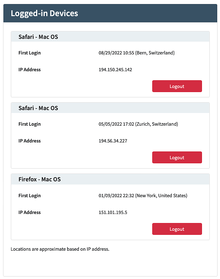 - A button to log out of the browser or device (if configured). The button is not available for the current device.