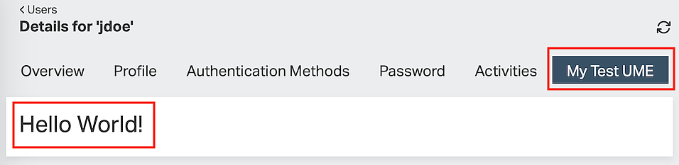 The following screenshot shows a very simple “Hello World” user management extension (UME) on the user detail page of user jdoe.
