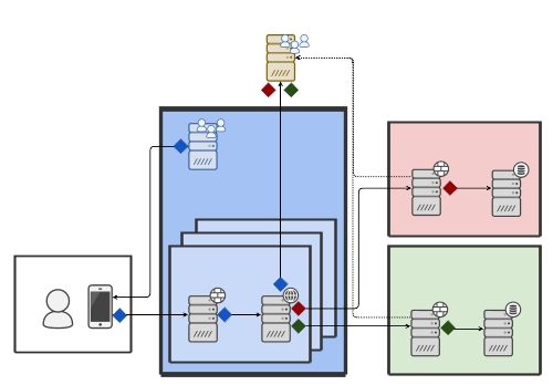 The services in the different frontend security zones connect to a number of central services zones (backend in red and green). These zones could be a centralized billing or a centralized order management component.