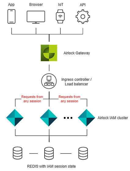 Airlock IAM relies on session state stored on the server side. Most requests processed by Airlock IAM must be able to access the up-to-date session state. If multiple IAM instances are active, it is relevant how session information is stored, and that it can be shared among the IAM.