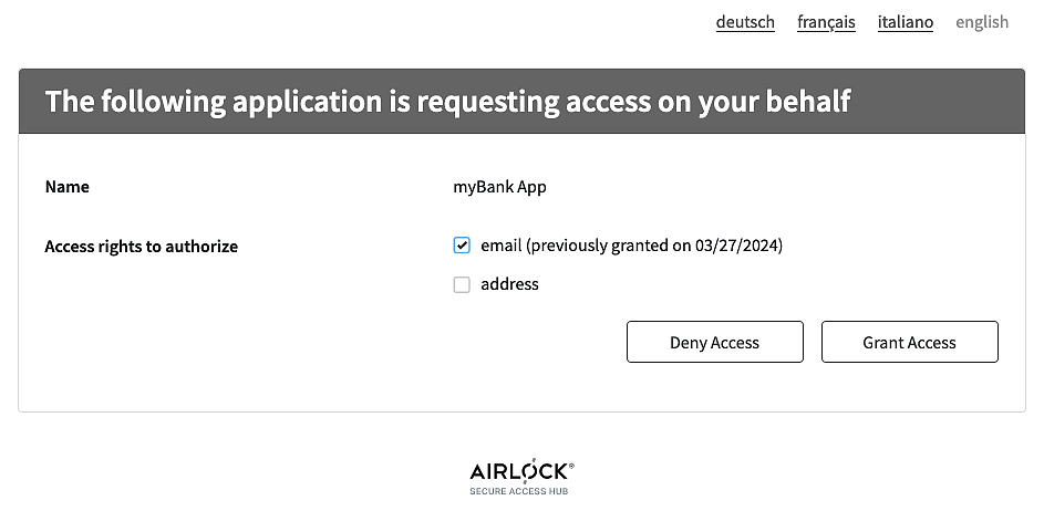 To make consent presentation more convenient for end users, consent can be stored in the database once the end user has granted it. In every future login flow, granted consents will be read from the database, their checkbox will be marked and the consent grant date will be displayed. If all grants and denials are already present, the consent screen will be skipped, and the flow will continue without interaction from the end user.