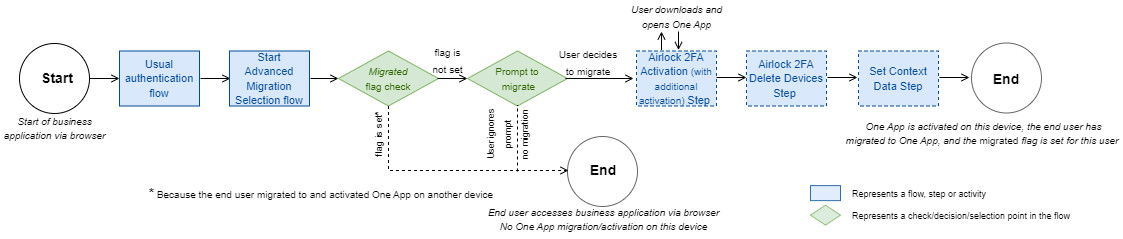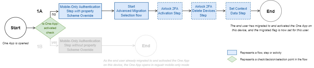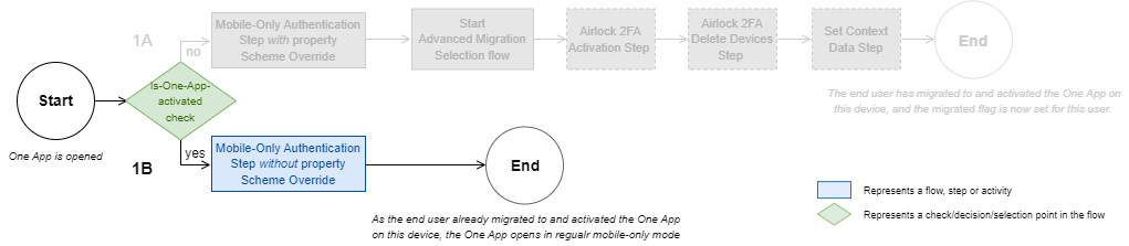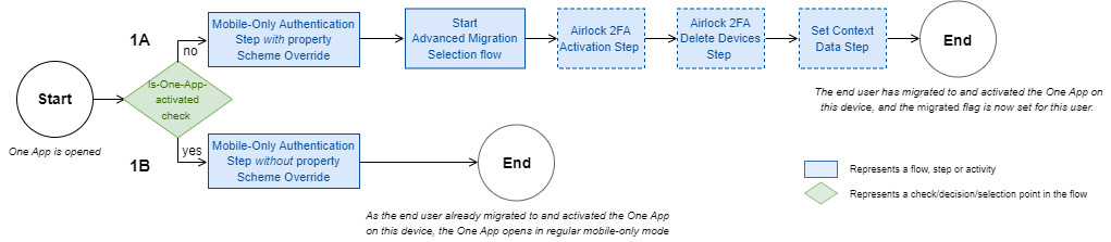 - One flow for the use case where an end-user has installed the new One App on their mobile phone, and is going to use/uses it in mobile-only mode. In the mobile-only mode, both the business app and the 2FA authentication functions run on the same mobile device. This first flow has two sub-flows: One sub-flow will migrate the user to and activate the One App, the other triggers the regular mobile-only authentication for the new One App, when migration and activation is completed.
