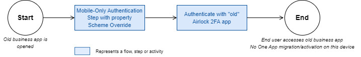 This flow represents the use case where an end-user wants to use the old business app/2FA app in mobile-only mode on a specific device, after they activated the new One App on another device. In this situation, the 2FA app service will always try to open the new One App for authentication. To still allow the use of the old apps, IAM introduced the Scheme Override feature. This feature allows replacing the One App URI (scheme) returned by the app service with the URI (scheme) of the “old” Airlock 2FA.