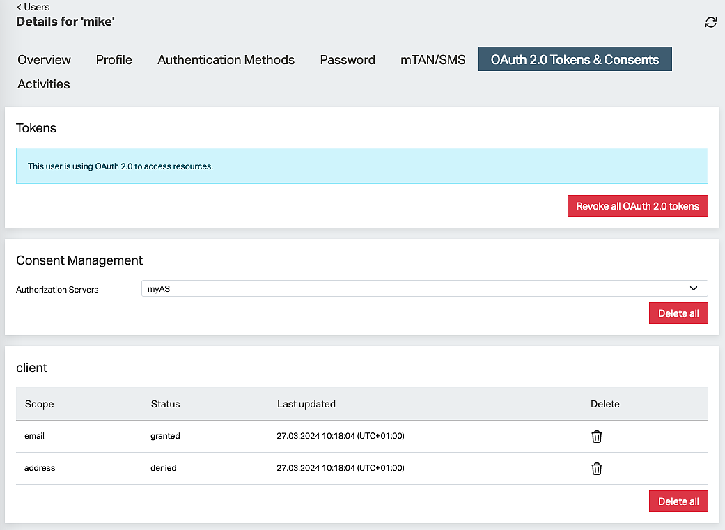 In the Adminapp, all stored consents are presented in the OAuth 2.0 Tokens & Consents tab of the user management. The information is grouped by authorization servers and by clients.
