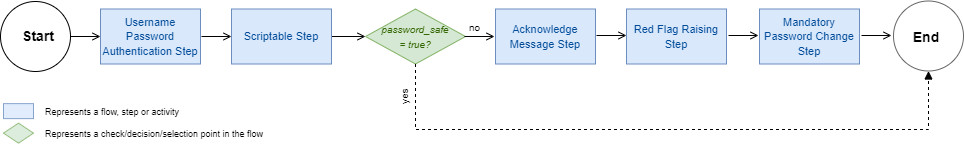 password_breached_countkey, and prompts the user to change their password. - Additionally, the Red Flag Raising Step raises a so-called red flag, which triggers the Mandatory Password Change Step.
