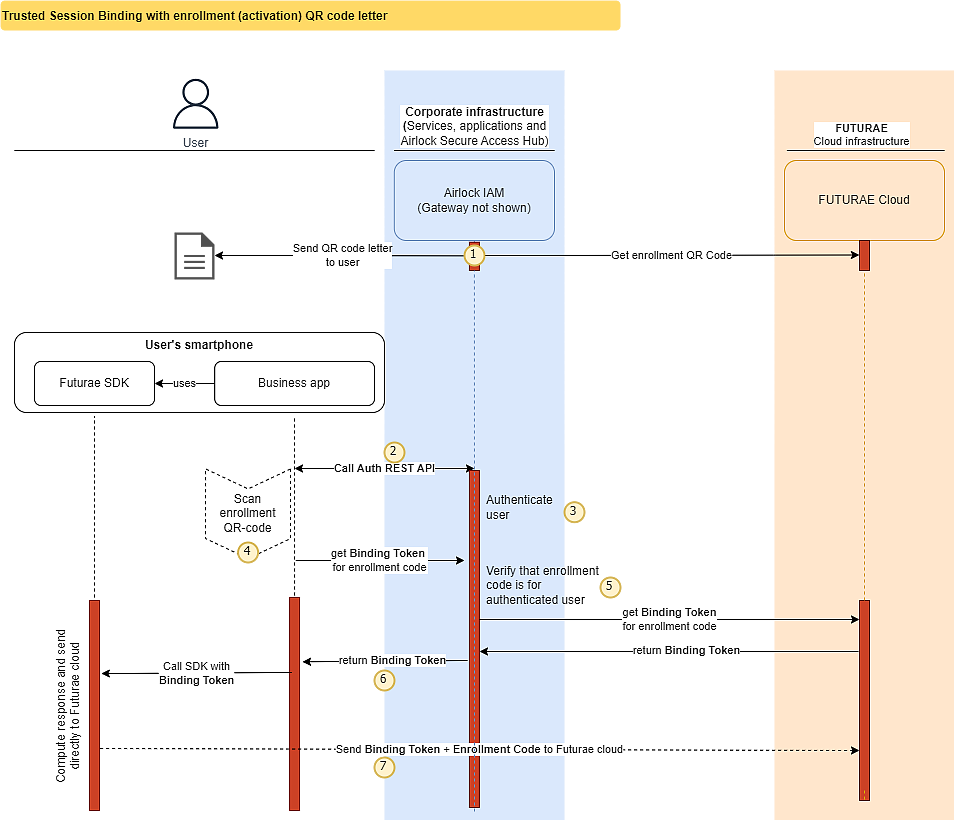 Consider the following flow diagram depicting the enrollment (activation) of an app with a QR-code letter using the Trusted Session Binding feature.