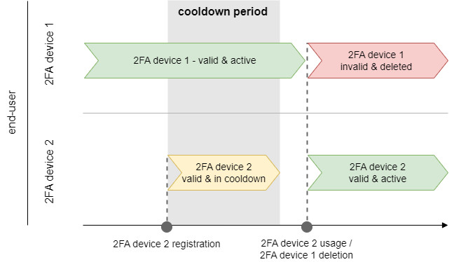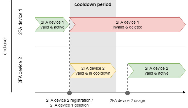 - If the end-user uses the old device during the cooldown period, the system will check the 2FA devices of the end-user in order to keep only the most recent registered device, which is the new one. However, because the new device is in cooldown and cooldown is respected, the system does not consider the new device for its check. In the perception of the system, the old device is still the most recently registered device. It is thus not deleted.