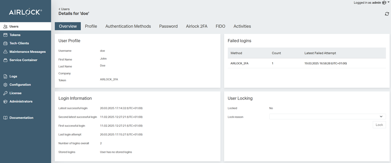 Overview | Summarizes information on the end-user, such as profile details, login information, and failed logins. The User Locking section shows whether the selected end-user is currently locked and if yes, the lock details. Administrators can unlock a locked user or manually lock the user, if needed. | User locking