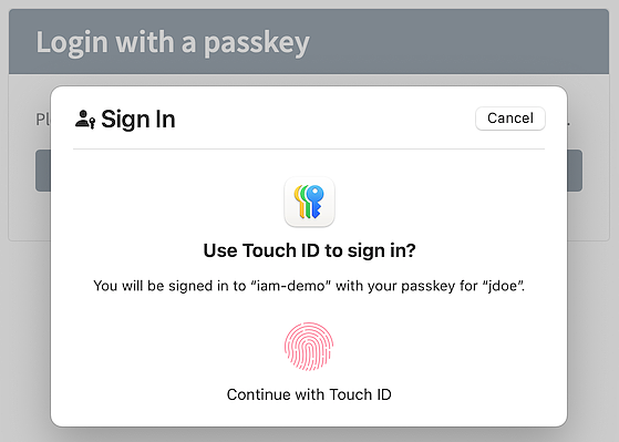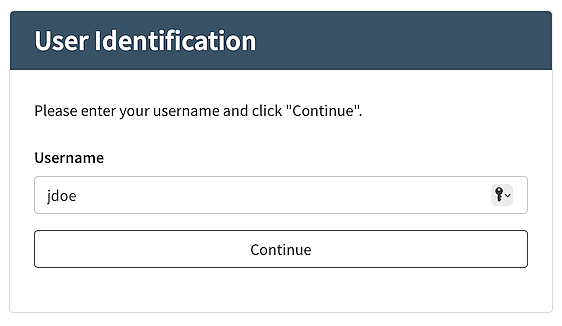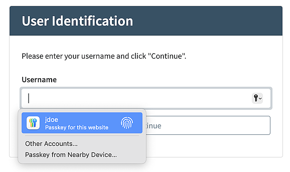 In this scenario, the user first enters their username. If the username is valid, the user uses the FIDO passkey to log in.