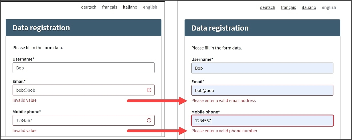- The Email and Mobile phone fields at the right throw different error texts that are specific to each field. This is achieved with the following field-specific translation key entries:
